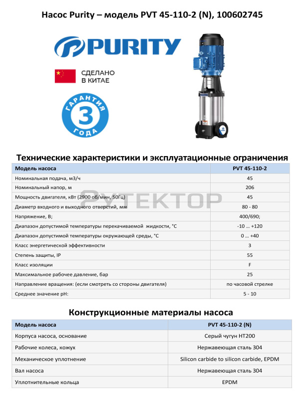 Вертикальный многоступенчатый насос PURITY PVT 45-110-2 (N)